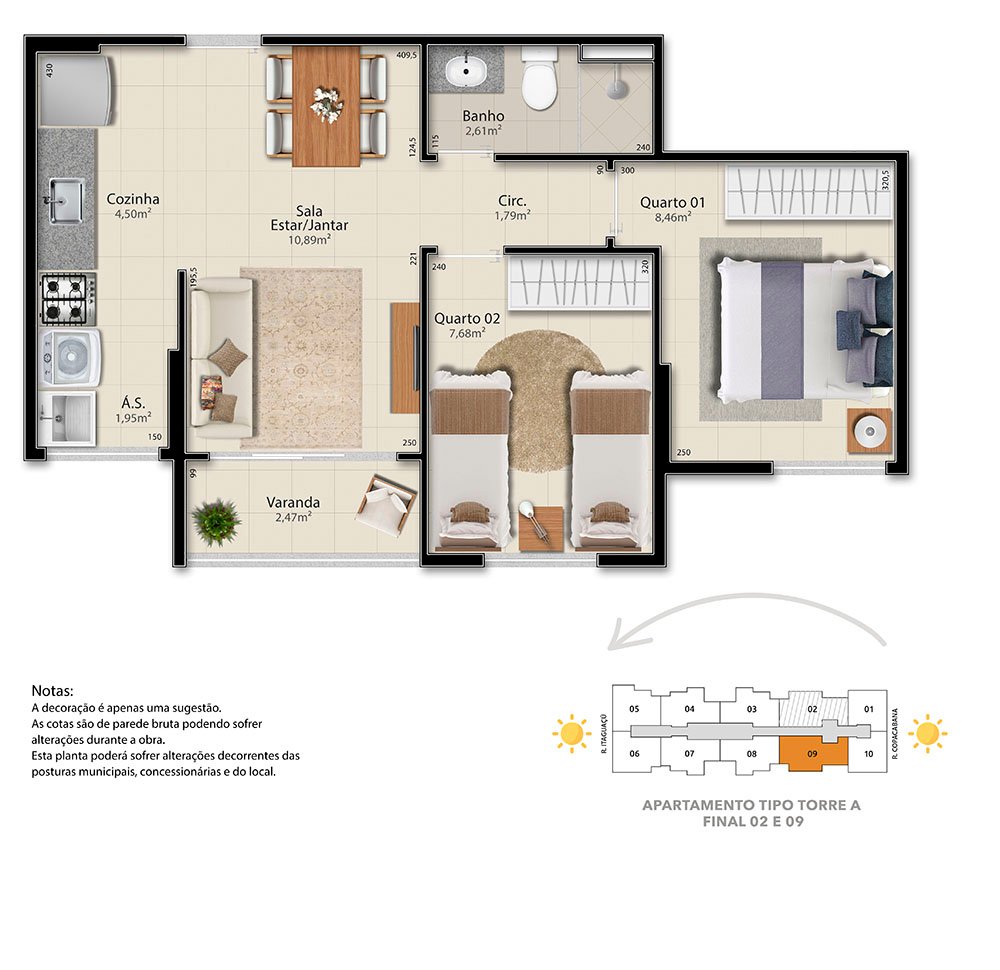 - 2 QUARTOS - 45,55 m² de área privativa;